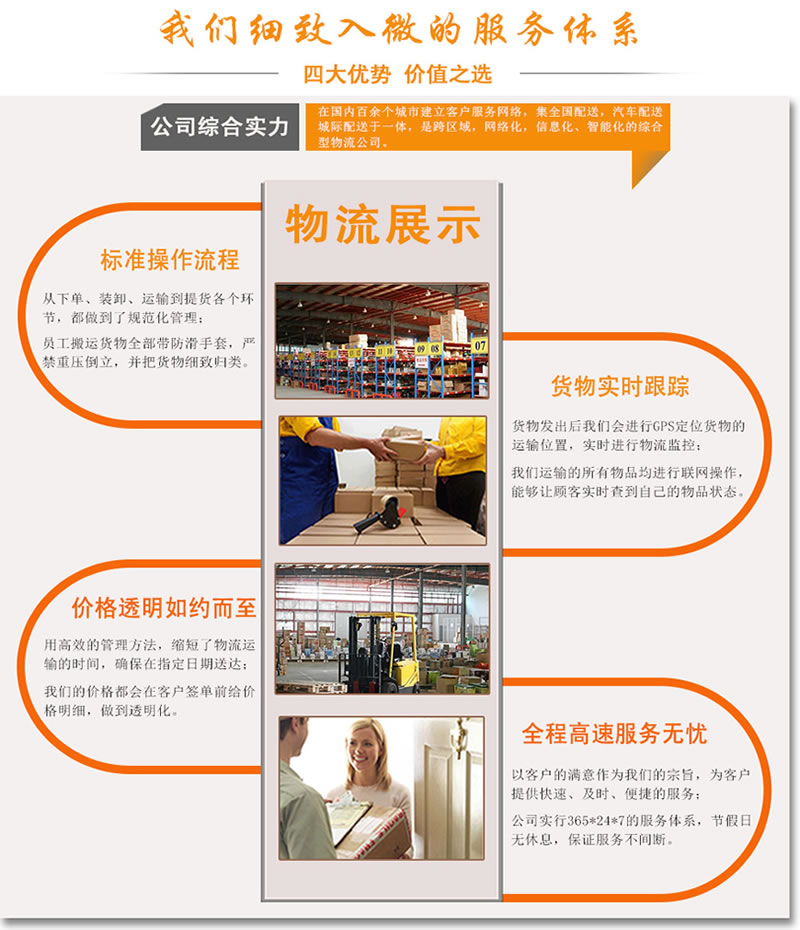 零担快运 整车运输 满足不同中小型企业的需求 GPS全程监控 密集的网点提高货物取送效率 特殊需求,专人随车押运 在大多数城市可提供取送货服务 门到门一站式服务 限时派送 小件快递 145条公路班车保证货物的运输时间 同城半日达、快捷、灵活 定点发车,限时派送 强大的分拨能力: 苏州、北京、上海、广州、济南、西安、武汉、成都八大分拨中心每日处理货物50万件以上 庞大的运输网络: 自有运输网络覆盖600多个大中城市 充足的运输车辆: 自有车辆百余台,社会整合车辆近千台 定时发车,准点配送:严格的时间管理保证按时发车,横贯东西南北的运输网络实现 网点间快速配送 安全保障:封闭型厢式货车,全程GPS定位跟踪,在途信息及时掌握